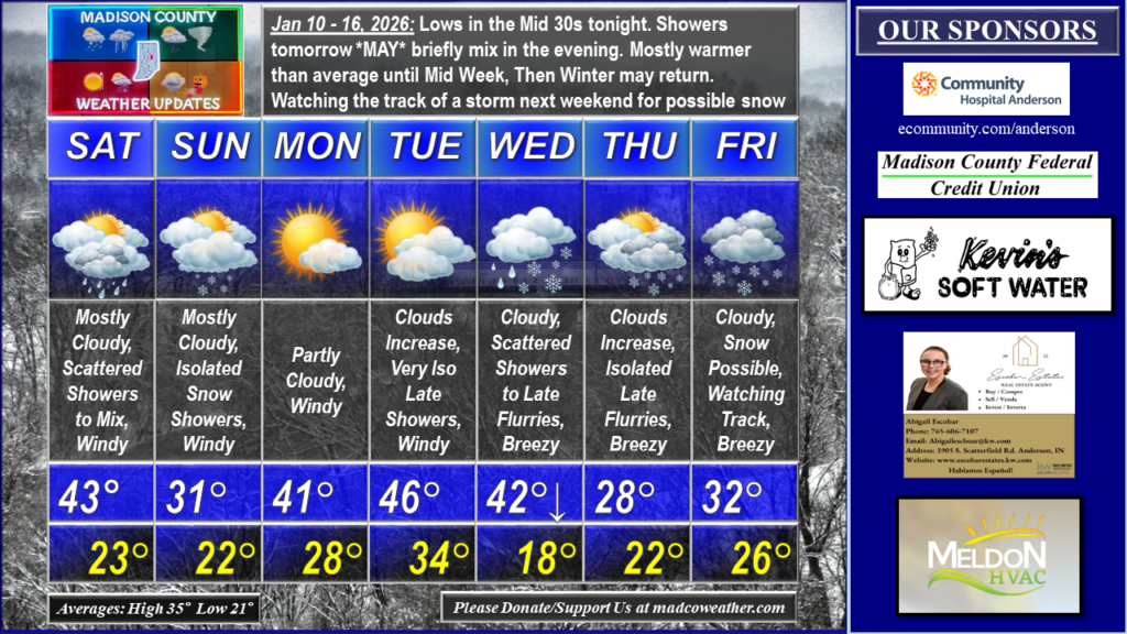 Today’s high of 62° occurred just after 1 AM. Lows in the Mid 30s tonight. Showers return tomorrow. If rain lingers late enough, it MAY briefly mix with snow in the evening. We’ll remain mostly warmer than average until Mid Next Week, Then Winter may return. Watching the track of a storm next weekend for possible accumulating snow. Right now, data has the snow path to our Southeast. However, the pattern indicates data should come Northwest over the next few days. We’ll see how things look early in the week. #MadCoWx #INwx
