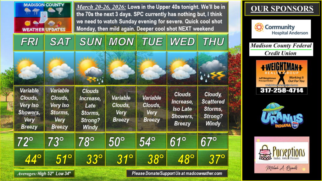 Lows in the Upper 40s tonight. We’ll be in the 70s the next 3 days. SPC currently has nothing but, I think we need to watch Sunday evening for severe. Quick cool shot Monday, then mild again. Deeper, but still brief, cool shot NEXT weekend. Mild air should return to start April. #MadCoWx #INwx