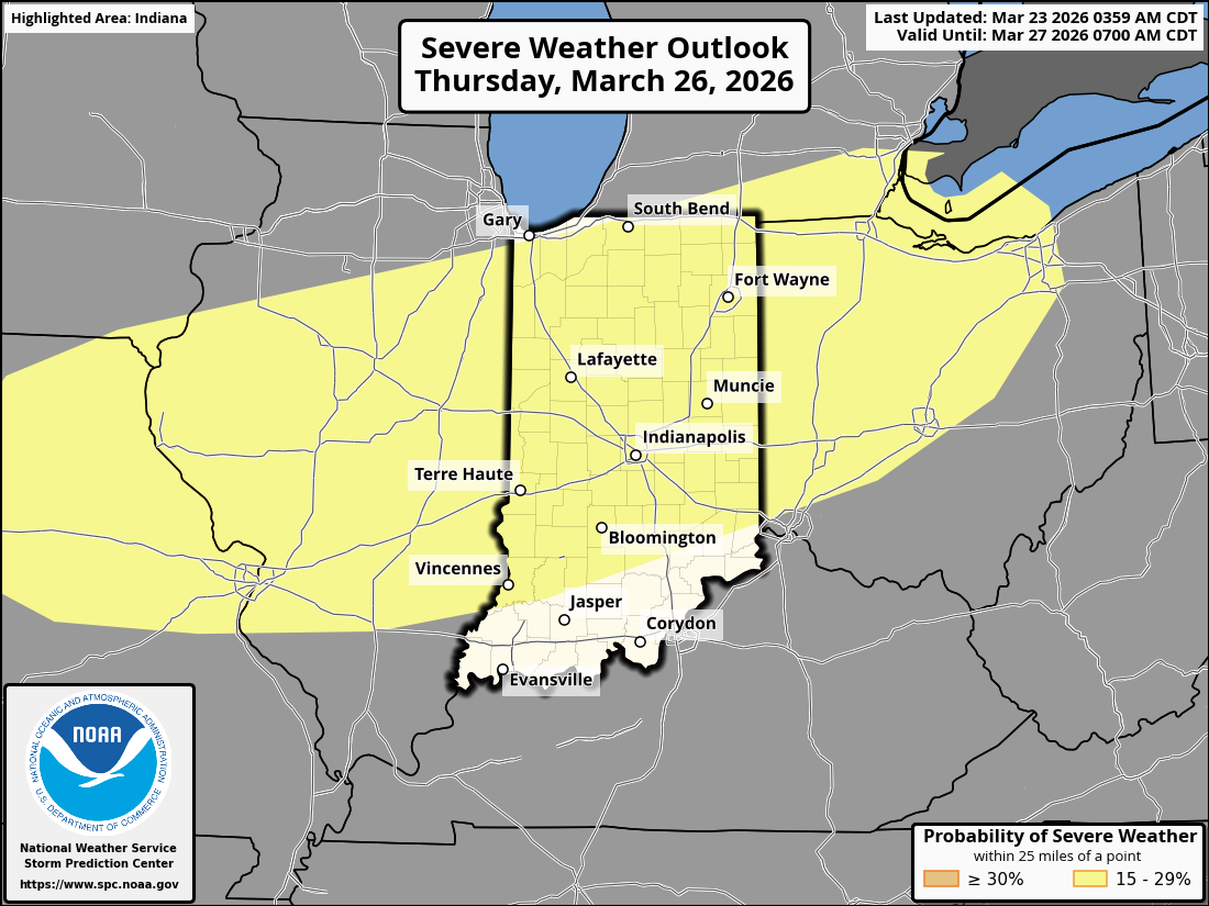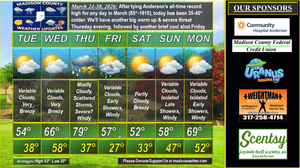After tying Anderson’s all-time record high for any day in March (85°- March 24, 1910), today has been 35-40° colder. We also had up to quarter sized hail in Northern Madison County last night. We’ll have another big warm up & severe threat Thursday evening. SPC already has a Day 4 Slight Risk for Severe. Those storms will be followed by another brief cool shot Friday into Saturday morning. We’ll return to the 60s NEXT week. #MadCoWx #INwx