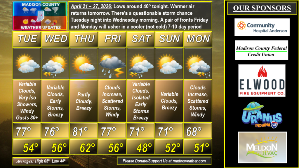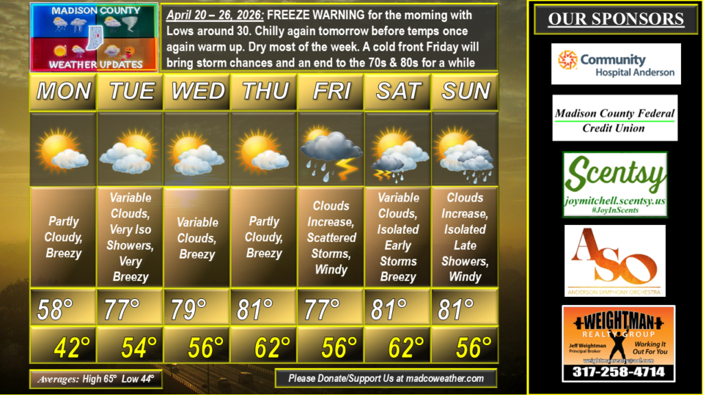 FREEZE WARNING is in effect for the morning with Lows around 30. Chilly again tomorrow before temperatures once again warm up. Dry most of the week. A cold front Friday will bring storm chances. That front will also bring an end to the 80s for at least a couple of weeks and the 70s will be much more limited late April into early May. #MadCoWx #INwx