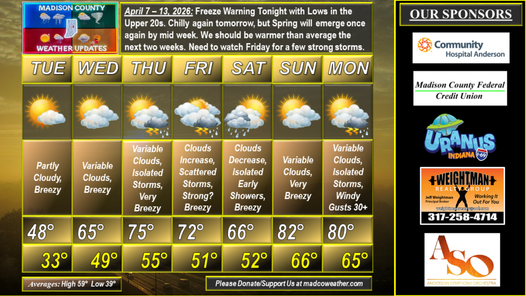 Freeze Warning is in effect for Tonight with Lows in the Upper 20s. Chilly again tomorrow, but Spring will emerge once again by mid week and we’ll be pretty warm by early NEXT week. We should be warmer than average the next two weeks at least, but maybe thru most of the rest of the month. We need to watch Friday for the possibility of a few strong storms.