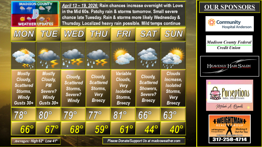 Rain chances increase overnight with Lows in the Mid 60s. Patchy rain & storms possible tomorrow. There’s a small severe chance late Tuesday, but timing and dynamics should keep it to our Northwest. Rain & storms will be more likely Wednesday & Thursday. Localized heavy rain is possible those days. Mild temperatures will continue the next 7-10 days. As a reminder, the average date of Anderson’s last frost is May 8th. So be aware we likely are NOT done with frost risks yet. #MadCoWx #INwx