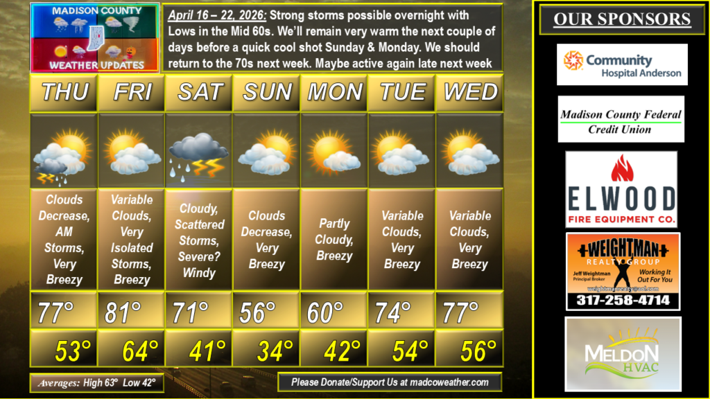 We had our third straight Record Warm Low temperature this morning. Strong storms possible overnight with Lows in the Mid 60s. We’ll remain very warm the next couple of days before a quick cool shot Sunday & Monday. We should return to the 70s next week. Maybe active again late next week. #MadCoWx #INwx